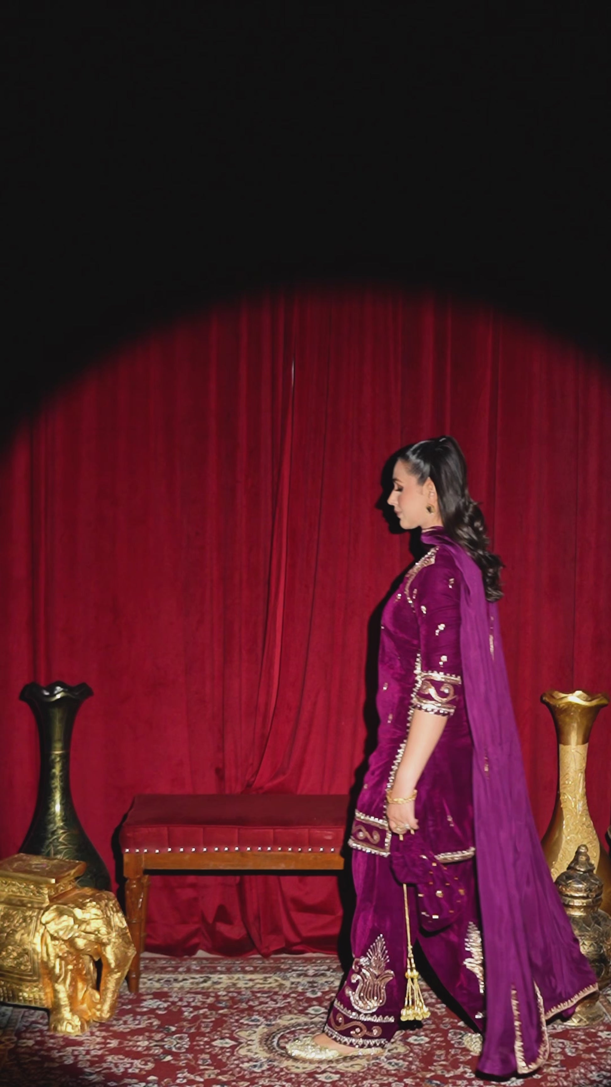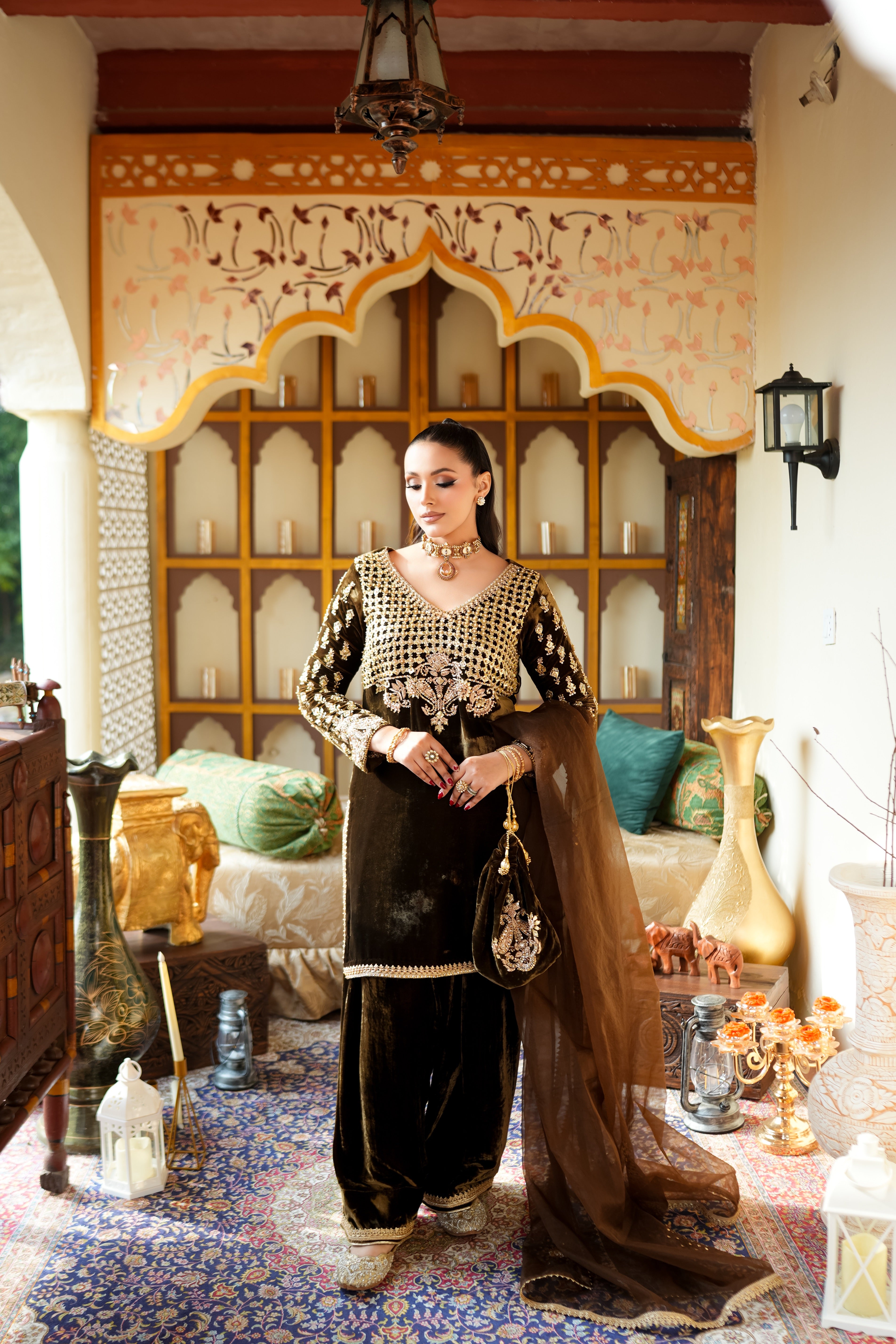 This outfit is crafted in premium French velvet,featuring detailed gota handwork on the shirt.Paired with...